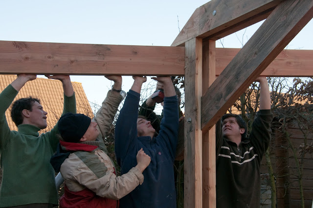 Nu konden we de achtermuur top balk plaatsen, gelukkig waren we deze keer met meer dan met twee, zoals bij de voorste muur: